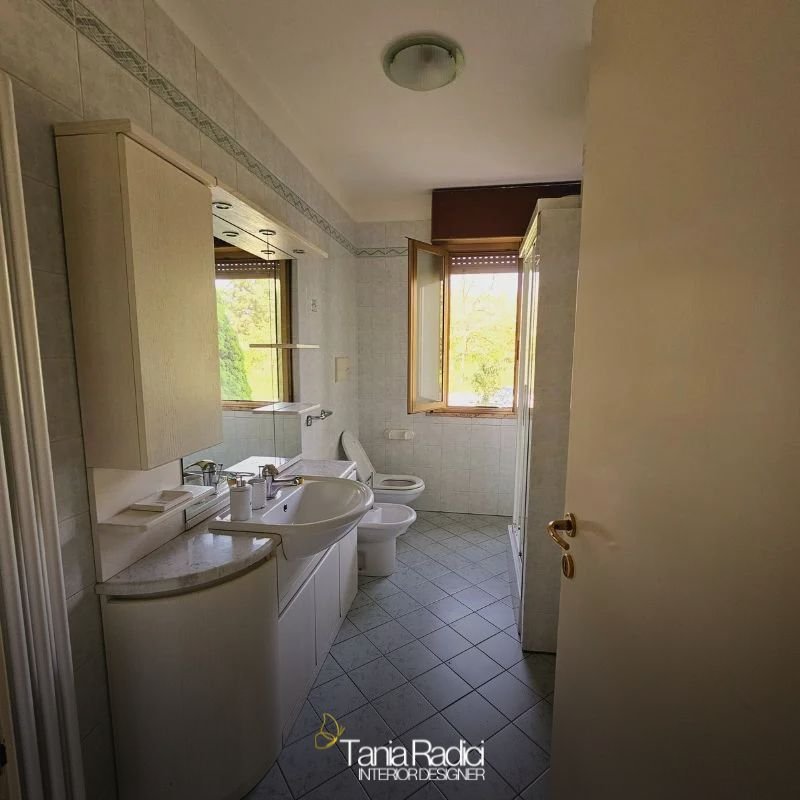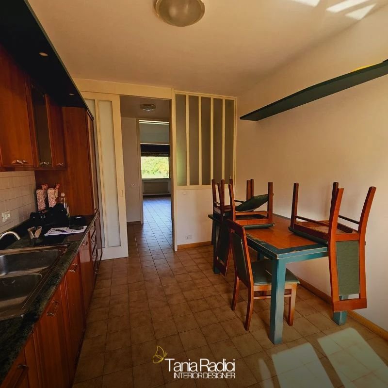 Abbattendo la parete tra ingresso e cucina ho creato un ambiente più aperto e luminoso, mantenendo il muro portante tra cucina e soggiorno. La veranda chiusa è stata trasformata in lavanderia, pratica e ben organizzata.