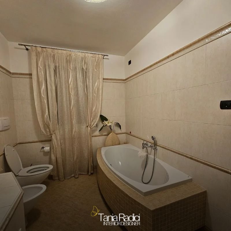 Al piano superiore, il bagno padronale è stato completamente ripensato in chiave più funzionale e luminosa. Al posto della vasca è stata creata una doccia ampia, comoda e dal design ricercato. Ho scelto ancora il marmo, ma in una palette più chiara: verde salvia e beige. Il risultato è uno spazio raffinato, rilassante e molto più pratico per l’uso quotidiano.